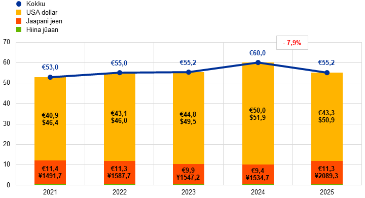 EKP välisvaluutapositsioon USA dollarites, Jaapani jeenides ja Hiina jüaanides vähenes 2025. aastal 4,8 miljardi euro võrra 55,2 miljardi euroni (vt joonis 5) valdavalt tingituna USA dollari ja Jaapani jeeni odavnemisest euro suhtes.[15] USA dollari odavnemine kajastub ka EKP ümberhindluskontode väiksemates saldodes (vt jagu 1.3.2 „Netoomakapital”), Jaapani jeeni odavnemine aga vahetuskursi allahindlusena, mida kajastatakse aasta lõpu seisuga tulude ja kulude aruandes, kuna vastavate ümberhindluskontode saldo oli 2024. aastal null (vt tulude ja kulude aruande jagu 1.3.3). Allahindlusest hoolimata kasvas Jaapani jeenides hoitavate varade maht tingituna tavapärasest tasakaalustamisest, et kooskõlastada EKP välisvaluutareservide koosseis seatud jaotuseesmärgiga. Selle tasakaalustamise käigus müüs EKP 2025. aasta esimeses kvartalis väikese osa oma USA dollarites hoitavatest varadest ja investeeris tulu täielikult Jaapani jeenidesse.