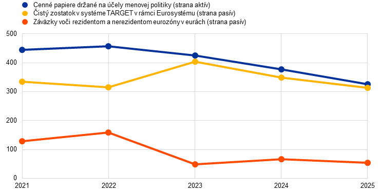 V roku 2025 redukcia súvahy ECB pokračovala, o 37,3 mld. € na 603,3 mld. €, opäť predovšetkým v dôsledku splácania cenných papierov v rámci programov APP a PEPP. Splácanie viedlo k zníženiu stavu cenných papierov držaných na účely menovej politiky, zatiaľ čo peňažné vyrovnanie týchto transakcií prostredníctvom účtov v systéme TARGET viedlo k zodpovedajúcemu poklesu záväzkov v rámci Eurosystému. Tento pokles bol len čiastočne kompenzovaný odlevom hotovosti v dôsledku nižších vkladov v ECB, čo zároveň viedlo k zníženiu ostatných záväzkov.