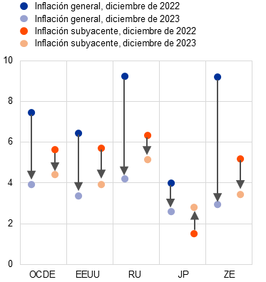 Notas: ZE: zona del euro. La inflación en la OCDE no incluye a Turquía y se calcula a partir de los IPC nacionales y las ponderaciones anuales del gasto en consumo final privado expresadas en términos de paridad del poder adquisitivo. La inflación subyacente excluye la energía y los alimentos. Las últimas observaciones corresponden a diciembre de 2023.