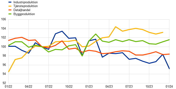 Anm.: Detaljhandeln anges i reala termer. De senaste observationerna avser december 2023 för tjänsteproduktionen, men annars januari 2024.