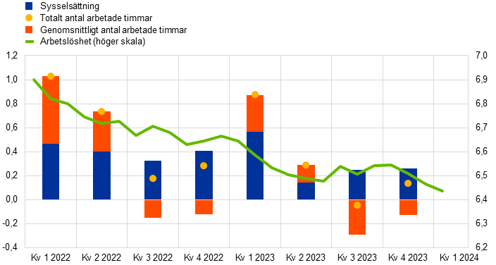 Euroområdets arbetsmarknad var överlag fortsatt motståndskraftig under 2023, även om arbetsmarknadsutvecklingen och enkätindikatorer i slutet av året pekade på en inbromsning. Arbetslösheten var i genomsnitt 6,5 procent under 2023. Den sjönk från 6,6 procent i januari till 6,5 procent i mars och var i stort sett stabil under resten av året (diagram 1.5). Den totala sysselsättningen och det totala antalet arbetade timmar stod sig väl i en stagnerande ekonomi och ökade under 2023 med 1,4 procent respektive 1,6 procent. Det genomsnittliga antalet arbetade timmar ökade med endast 0,2 procent under 2023 och låg under det sista kvartalet 2023 1,3 procent lägre än före pandemin, vilket sannolikt berodde på faktorer som hamstring av arbetskraft (det vill säga att företag behåller fler arbetstagare än nödvändigt vid nedgångar) och ökad sjukfrånvaro. Arbetskraftsdeltagandet i åldersgruppen 15–74 år ökade till 65,7 procent under fjärde kvartalet 2023, vilket är 1,1 procentenheter högre än före pandemin. Under det andra halvåret visade efterfrågan på arbetskraft vissa tecken på att lätta, med en vakansgrad som fortfarande låg högt men som gradvis sjönk från den högsta nivån som uppnåddes under andra kvartalet 2022. Även om ECB:s räntehöjningar fortsatte att slå igenom kraftfullt i ekonomin var överlag den totala sysselsättningen och euroområdets arbetsmarknad – som är bland de EU-mål som ECB kan bidra till förutsatt att det inte påverkar prisstabilitetsmålet – fortfarande relativt motståndskraftiga.