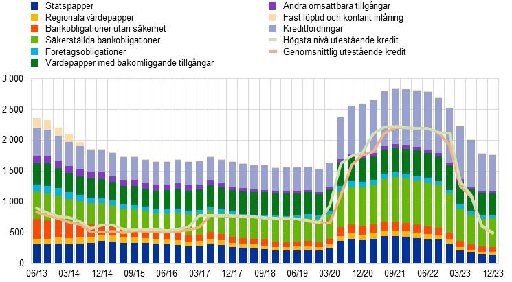 Parallellt med detta påskyndade vi normaliseringen av Eurosystemets balansräkning för att säkerställa att den förblir i linje med vår övergripande inriktning. Den minskade med över 1 000 miljarder euro 2023, och en stor del av denna minskning berodde på förfall och förtida återbetalningar inom ramen för våra riktade långfristiga refinansieringstransaktioner. Under årets lopp avslutade vi även återinvesteringar inom ramen för APP-programmet (program för köp av tillgångar). I december tillkännagav vi också en gradvis utfasning av återinvesteringar inom ramen för PEPP-programmet (stödköpsprogram föranlett av pandemin).