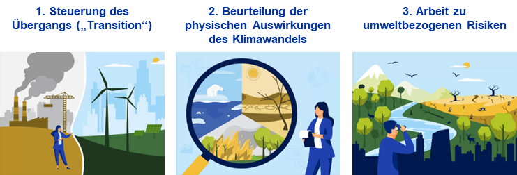 Mit der Einführung ihres Klima- und Umweltplans 2024-2025 hat die EZB ihre Aktivitäten im Bereich Klimawandel ausgeweitet. Der Schwerpunkt liegt dabei auf drei Kernbereichen: die Auswirkungen und Risiken des Übergangs zu einer ökologischen Wirtschaft; die zunehmenden physischen Auswirkungen des Klimawandels und die wirtschaftlichen Auswirkungen der Anpassung an den Klimawandel; sowie die Risiken der Naturzerstörung und deren Wechselwirkungen mit Klimarisiken.