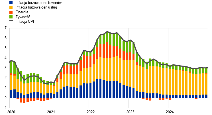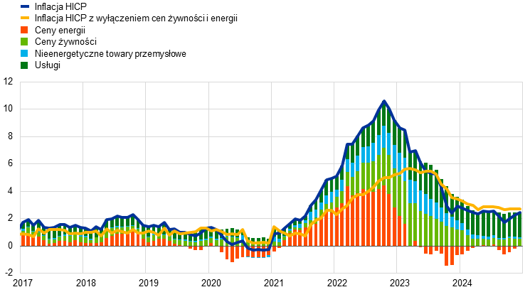 Źródła: Eurostat, Eurosystem staff macroeconomic projections for the euro area, grudzień 2024, obliczenia EBC.