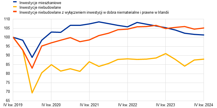 Inwestycje mieszkaniowe w 2024 mocno spadły z powodu wciąż trudnych warunków finansowania i niskiego popytu. Inwestycje mieszkaniowe spadły o 4,0% w porównaniu z 2023, co stanowi największy roczny spadek od 2009, tj. od czasu kryzysu finansowego. Spadek ten był w głównej mierze spowodowany opóźnionym oddziaływaniem zaostrzenia polityki pieniężnej, wynikającym z wysokiego oprocentowania kredytów hipotecznych i zaostrzenia kryteriów udzielania kredytów. Mimo że dochody realne odrabiały straty, a wzrost cen nieruchomości był niewielki, zaostrzone warunki finansowania ograniczały przystępność cenową mieszkań i mocno obniżyły popyt na nieruchomości mieszkaniowe. Niemniej jednak, dzięki silnemu ożywieniu inwestycji mieszkaniowych po pandemii, częściowo wspieranemu przez (obecnie wygasłe) hojne zachęty podatkowe we Włoszech, inwestycje mieszkaniowe pod koniec 2024 utrzymały się na poziomie 1,3% powyżej poziomu sprzed pandemii, co jednak było gorszym wynikiem niż w przypadku spożycia prywatnego na poziomie 3,1%, czy inwestycji niebudowlanych (5.2% po wyłączeniu kategorii dóbr niematerialnych i prawnych w Irlandii).