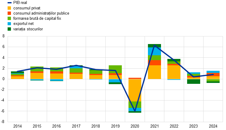 PIB real al zonei euro a consemnat o creștere de 0,9% în 2024 comparativ cu 0,4% în 2023 (Graficul 1.3). Ritmurile trimestriale de creștere au devenit pozitive la începutul anului 2024 după cinci trimestre consecutive de stagnare, însă au consemnat o nouă moderare la finele anului. Consolidarea creșterii s-a datorat în principal sectorului serviciilor, care a continuat să beneficieze de schimbările structurale postpandemice, printre care trecerea mai rapidă la o economie bazată într-o mai mare măsură pe cunoaștere, tranziția verde și schimbarea modelelor de consum. Redresarea veniturilor reale, schimburile comerciale internaționale și programul „Next Generation EU“ (NGEU) au sprijinit, de asemenea, creșterea economică. În același timp, activitatea din sectorul industrial s-a menținut la un nivel scăzut din cauza unei combinații de factori structurali și ciclici. Sectorul industrial a fost mai afectat decât serviciile de menținerea condițiilor restrictive din ciclul anterior de înăsprire a politicii monetare și de costurile ridicate de producție. Deși impactul maxim al înăspririi asupra activității economice a fost atins, conform majorității modelelor, între sfârșitul anului 2023 și începutul anului 2024, ciclul de relaxare a politicii monetare care a început la jumătatea anului 2024 nu s-a transmis încă la nivelul economiei. Alți factori care au afectat sectorul industrial au fost pierderea cotei de piață a exporturilor zonei euro, precum și provocările în materie de reglementare și incertitudinea ridicată legată atât de evenimentele politice, cât și de cele geopolitice. În ansamblu, creșterea PIB din 2024 a reflectat contribuțiile pozitive din partea consumului privat și public, precum și a schimburilor comerciale nete, în timp ce investițiile și variația stocurilor au frânat activitatea economică.