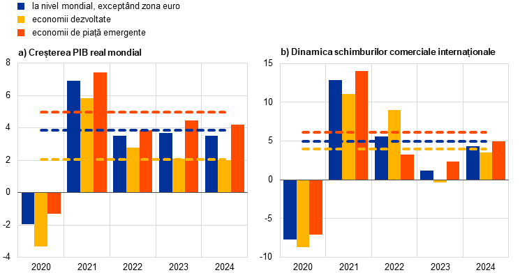Notă: Tabloul a): „PIB global“ exclude zona euro. Datele agregate sunt calculate pe baza PIB ajustat cu ponderile pe baza parității puterii de cumpărare. Tabloul b): dinamica schimburilor comerciale internaționale este definită ca expansiunea importurilor globale, inclusiv a importurilor în zona euro. În ambele tablouri, liniile întrerupte indică mediile pe termen lung în perioada 1999-2023, iar cele mai recente date se referă la anul 2024 și sunt actualizate la 28 martie 2025.