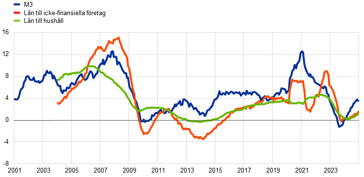 Den globala ekonomiska aktiviteten förblev motståndskraftig under 2024 och fortsatte att öka i måttlig takt. Under året ökade osäkerheten till höga nivåer mot bakgrund av förhöjda geopolitiska spänningar och frågor kring den ekonomiska politiken, särskilt efter presidentvalet i USA. Den globala handeln återhämtade sig från 2023 års avmattning till följd av att importen hade tidigarelagts med tanke på osäkerheten kring geopolitik och handelspolitik. Den globala inflationen avtog ytterligare, även om inflationsnedgången dämpades av en ihållande tjänsteinflation i utvecklade ekonomier. Euron försvagades mot den amerikanska dollarn samt i mindre utsträckning även i nominella effektiva termer. Euroområdets ekonomi stärktes under 2024, till stor del på grund av en positiv global tillväxt och en motståndskraftig tjänstesektor, i ett läge med fallande total inflation. Samtidigt var industrin fortsatt svag då den påverkades av restriktiva finansieringsförhållanden, höga kostnader för energi och andra insatsvaror, strukturella brister och förhöjd osäkerhet. Medan ECB:s penningpolitiska åtstramning från tidigare år fortsatte att få ett kraftfullt genomslag i den ekonomiska aktiviteten och understödde den varaktiga inflationsnedgången under 2024, var arbetsmarknaden fortsatt ganska motståndskraftig. Regeringarna i euroområdet fortsatte att avveckla de stödåtgärder som vidtagits som respons på covid-19-pandemin och energipris- och inflationschockerna och drog tillbaka en del av sina tidigare finanspolitiska lättnader. Den totala inflationen i euroområdet sjönk ytterligare under 2024, men i långsammare takt än året innan eftersom effekterna från den avtagande energiinflationen hade upphört. Det underliggande inflationstrycket sjönk till följd av de avtagande effekterna av tidigare utbudschocker och en svagare efterfrågan i kombination med strama penningpolitiska förhållanden och finansieringsförhållanden samt en stram finanspolitik, men påverkades också alltjämt av den starka löneutvecklingen.