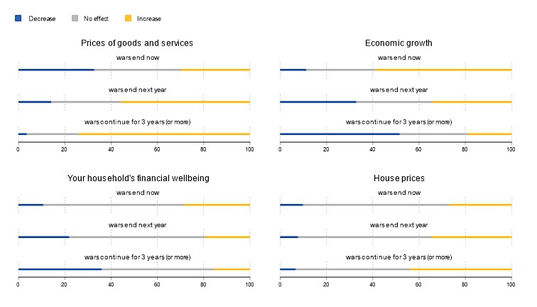 It is plausible to assume that consumer concerns about geopolitical risks weigh on broader economic sentiment. To test this link, we confronted consumers with different geopolitical scenarios. Specifically, the CES in September 2024 asked each participant to consider one out of three scenarios regarding the duration of two current military conflicts: the war in Ukraine and the conflict in the Middle East. The three scenarios were: i) an immediate or relatively swift end of these conflicts (within three months); ii) a one-year prolongation; and iii) an extension of three years or more. The survey then asked respondents to rate how their given scenario would affect their economic expectations for themselves and for the whole economy over the next twelve months. Answers were given with a 5-point scale ranging from “increase (a lot)” to “decrease (a lot)”.