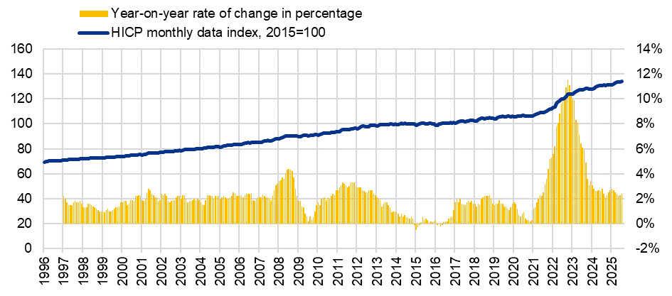 Left-hand scale: HICP monthly index with reference baseline 2015=100; right-hand scale: year-on-year rate of change in percentage.