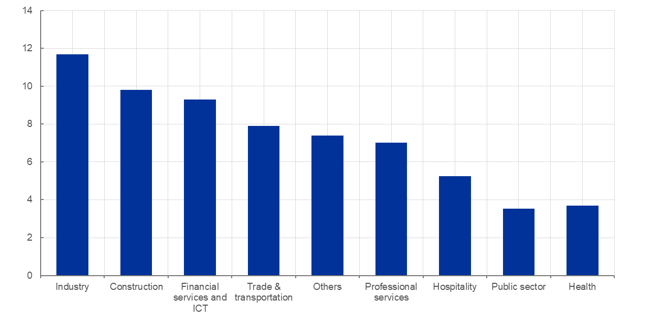 Taking an even closer look, we see that workers in more trade-oriented and cyclical sectors – currently under pressure of other shocks such as high energy prices – are more likely to perceive an increasing risk of job loss following the increase in US tariffs. Specifically, workers in industry, construction or trade feel more negatively affected by those tariffs (see Chart 3). These sectors are either more reliant on US exports or generally more prone to upswings and downswings. By contrast, workers in the public or health sectors do not usually sell their services to US customers. Demand for their services is also largely independent of overall economic conditions. Accordingly, the CES results show that workers in these sectors are much less concerned about their jobs following the tariff hikes. Workers in the financial services and ICT sectors are also more exposed to US tariffs and report higher job fears. This is especially the case for workers in Ireland and the Netherlands, which host the European headquarters for many US firms and are very open economies.[4] This means that workers in these countries are more vulnerable to stricter trade policies.