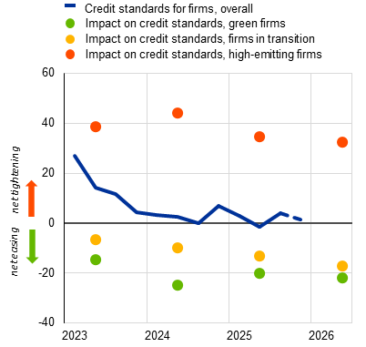 The latest observations are for the third quarter of 2025 (past) and the fourth quarter of 2025 (expected) for credit standards, for the second quarter of 2024 – third quarter of 2025 (past), and for the third quarter of 2025 – second quarter of 2026 (expected) for the impact of climate change.