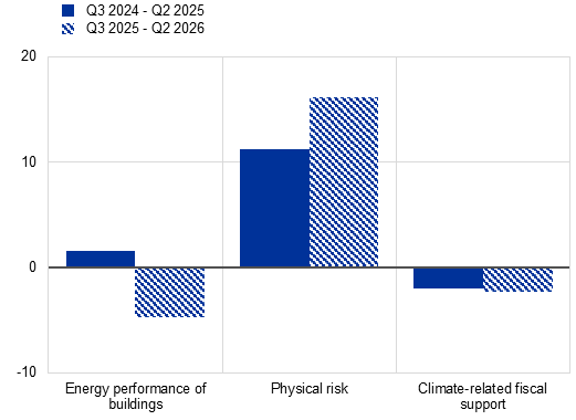 Meanwhile, investment in reducing the physical risk of real estate – e.g. making buildings resilient against storms or rising water levels – had only a small positive impact on housing loan demand over the past 12 months, although banks expect this impact to increase somewhat over the next 12 months (Chart 4, panel b). Similarly to business lending, banks consider uncertainty over future climate-related regulation to be a factor dampening housing loan demand. This may have contributed to postponing modernisation investment in existing buildings. Conversely, preferential bank lending rates aimed at enhancing the sustainability of real estate, along with climate-related fiscal support, had a positive impact on housing loan demand over the past 12 months and are expected by banks to continue to contribute positively in the next 12 months.
