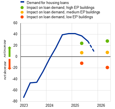 Notes: In panel a), net percentages are defined as the difference between the percentages of banks reporting an increase in loan demand (blue line) or a positive impact of climate change on loan demand (dots) and the percentages of banks reporting a decrease or negative impact. The solid line refers to actual values in the past three months, while the dashed part of the line refers to banks’ expectations for the next three months. The dots refer to actual values in the past 12 months, except for the last dot, which refers to banks’ expectations for the next 12 months. Panel b) shows the main factors that contribute, according to the banks, to the impact of climate change on bank loan demand. The climate-related question on housing loans was introduced in the July 2025 BLS.