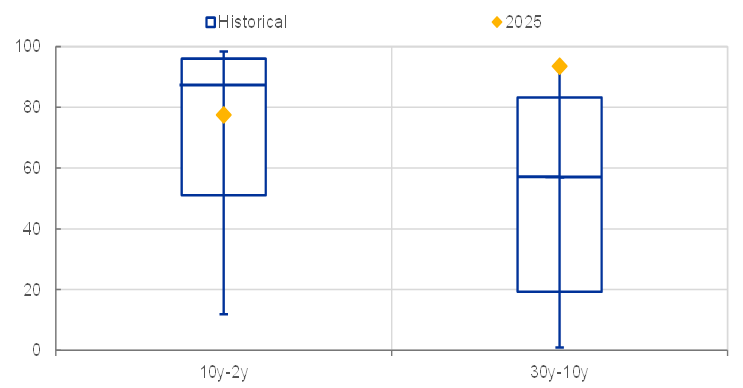Notes: The chart is based on principal component analyses that, for each curve segment and calendar year, use as input the respective risk-free (i.e. OIS) curve slopes for the euro area, United States, United Kingdom and Japan, normalised in the form of z-scores. The box plots show the minimum, 25th, 50th, 75th percentiles and maximum of the share of variance of euro area risk-free curve slopes explained by the first principal component in the 2013 to 2025 calendar years (“Historical”). Diamonds denote the same explained share in 2025.