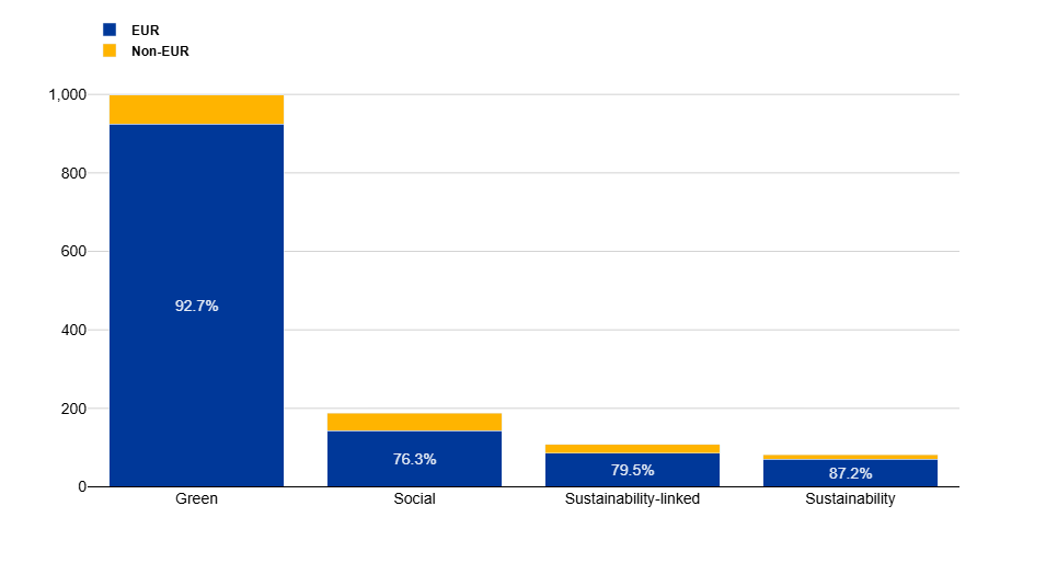 Euro area issuances of sustainable debt securities by currency of denomination