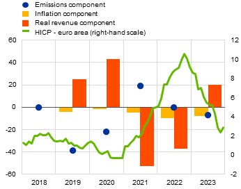 In our analysis, company revenues serve as the key proxy for economic size, as it is the most widely used measure. However, not every decline in carbon intensity necessarily indicates a greening of the portfolio. Company revenues are measured in nominal terms and an increase in revenues (while emissions remain constant) may overstate the actual decline in carbon intensity when considered in real terms. When we track trends over time, it is essential to adjust growth in nominal revenues for inflation. Chart 2 shows that part of the year-on-year decline in portfolio carbon intensity is due to inflation; however, this is a small part compared with that attributable to real revenues. Still, in 2022 and 2023 inflation contributed to the decrease in carbon intensity as much as, or even more than, emissions reduction, with the largest impact in 2022, coinciding with the Harmonised Index of Consumer Prices (HICP) inflation trend in the euro area over this period. This shows that ignoring the role of inflation in the economy would lead to underestimating actual carbon intensity. Looking ahead, we will continue refining the methodology on inflation adjustment, along with other enhancements in the area of indirect emissions and forward-looking indicators.