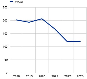 Notes: Securities include listed shares and debt securities. WACI is adjusted for inflation and exchange rate effects. Company revenues are adjusted for inflation using Gross Value Added (GVA) deflators from International Data Cooperation (IDCM) and National Accounts by Industry (INA) series. GVA reflects the contribution of a company, or sector to the economy, capturing the value of goods and services produced minus the cost of inputs. Using GVA deflators ensures that the adjustment for inflation is specific to the sector in which the company operates. For illustration, the chart presents the broader inflation measure - the Harmonised Index of Consumer Prices (HICP) - reflecting general inflation trends, while remaining consistent with the trajectory of the selected deflators. Portfolio weight component and exchange rate component not shown. For more information, please refer to the statistical paper and the technical annex.