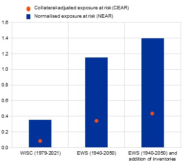 The results indicate that northern and coastal regions of Europe face the highest risk from windstorms (Chart 3, panel a). Chart 3 demonstrates the impact of the enhancements (panel b), which presents the expected loss indicators, the normalised exposure at risk (NEAR) and collateral-adjusted exposure at risk (CEAR) indicators, calculated using different sets of data. Incorporating newer datasets and updated climate models increases expected losses more than threefold. A further increase is observed when we add inventories to the assessment: expected losses rise by 22% for NEAR, which represents the baseline indicators, and by 26% for CEAR, which also accounts for collateral pledged with the loans (for further details on the indicators, see the statistical paper and technical annex).