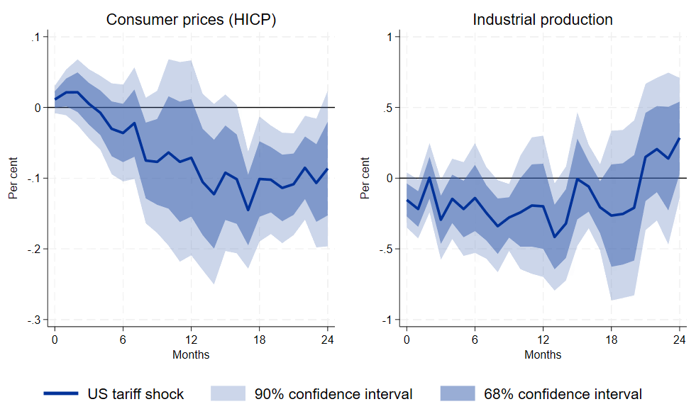 Second, we isolate those trade surprises that are plausibly related to tariffs. To this end, we compare the sign of the trade surprise with preceding changes in US tariffs on euro area goods. When effective US tariffs on euro area goods rose over the previous year, and euro area exports to the United States were unexpectedly weak, we interpret this as a trade-tightening TTS. When tariffs fell and euro area exports were unexpectedly strong, we treat it as a trade-easing TTS.[4] We then estimate how the TTSs identified affect euro area prices and activity using local projections.[5]