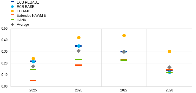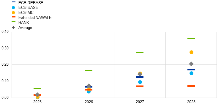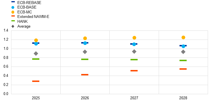 To cover a wide range of transmission channels, the analysis uses both semi-structural and dynamic stochastic general equilibrium (DSGE) models developed at the ECB. The semi-structural models employed include core projection models, namely the ECB-MC model (Angelini et al., forthcoming) and its euro area counterpart, ECB-BASE (Angelini et al., 2019 and Bańkowski, 2023). We also use a version of the latter that incorporates forward-looking expectations: ECB-REBASE (Adjemian et al., 2024). In addition, we employ two DSGE models. The first is an extended version of the ECB’s NAWM-E model (Coenen et al., 2024), which incorporates a global and regionally disaggregated structure.[3] The second, which is a newly developed model with household heterogeneity – a so-called Heterogeneous-Agent New Keynesian model, or HANK model (see Kase and Rigato, 2025) – allows us to capture distributional effects more explicitly. We introduce the same government purchase shock into all models and harmonise the simulation modalities to the extent possible. Importantly, monetary policy is assumed to be active across all simulations.[4]
