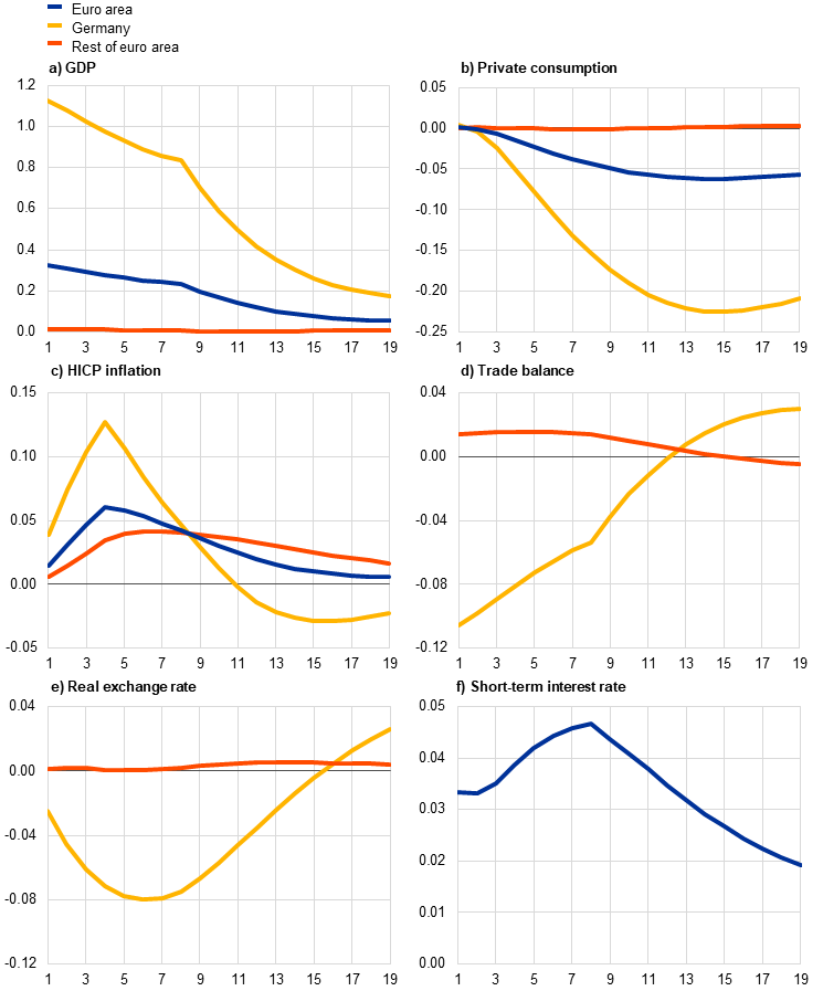 Notes: The simulation assumes a temporary increase in German government consumption spending by 1% for two years starting from period 0. The additional spending is then reduced every quarter by a factor of 0.9. Responses are expressed as percentage deviations from the baseline, except for inflation, trade balance and the short-term interest rate, which are expressed as percentage point deviations.