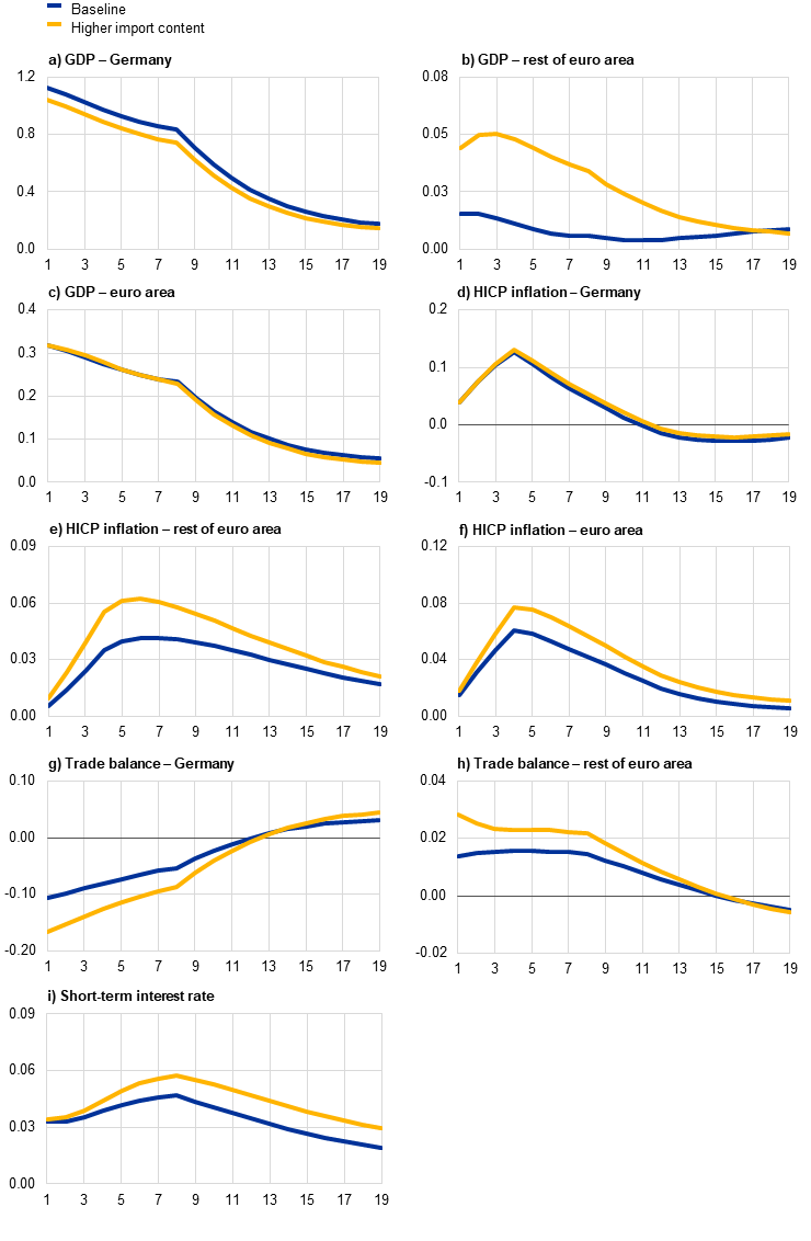 Notes: The simulation assumes a temporary increase in German government consumption spending by 1% for two years starting from period 0, after which there is a gradual unwinding. Responses are expressed as percentage deviations from the baseline, except for inflation, trade balance, and the short-term interest rate, which are expressed as percentage point deviations. Higher import content assumes that the import content of government consumption is doubled from 2% to 4%.