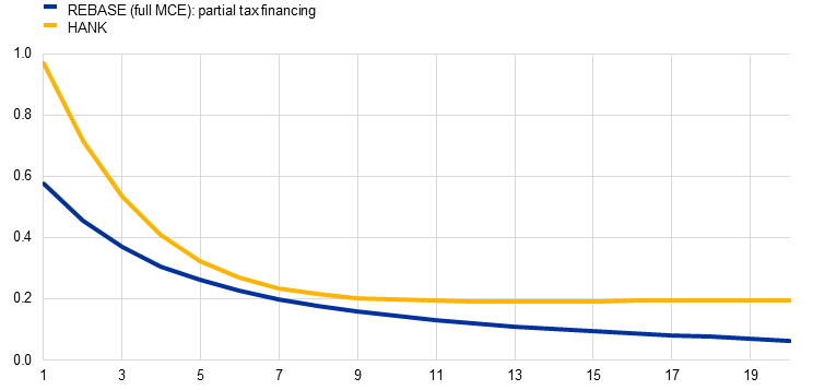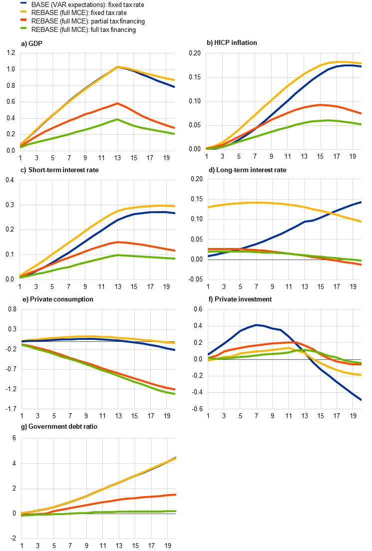Stronger forward-looking behaviour leads to an earlier and faster increase in financing rates, with an adverse impact on investment, but may stimulate consumption via households’ expectations of higher future income.[5] Chart 3 compares the macroeconomic response with backward-looking (blue lines) and forward-looking (yellow lines) expectations with unchanged tax rates. Under backward-looking expectations, there is consumption and investment crowding-in as the economy gradually becomes aware of the demand and income impulse, with financial conditions tightening only gradually. Under the forward-looking setting, expectations of future policy rate hikes are reflected in long-term interest rates sooner, and the resulting worsening of borrowing conditions adversely affects investment dynamics over the shorter horizon. Generally, consumption decisions are also affected by tighter borrowing conditions, albeit to a much lesser extent than investment decisions. Instead, consumption increases on account of higher expected income.[6] The prospects of higher income in the future are anticipated in the forward-looking model, which leads to stronger consumption dynamics. In both the BASE and the REBASE model specifications, private consumption and investment are estimated to be crowded out over the longer run as the effects of higher production and incomes start to fade and the financial market tightening causes the economy to contract. Anticipation of the spending pattern in the forward-looking model also leads to mild frontloading in price and wage setting dynamics and, in turn, to a somewhat faster increase in HICP inflation.