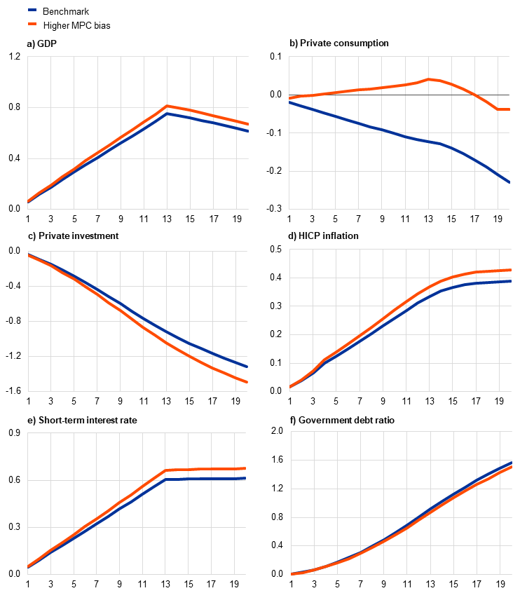 The effects of fiscal policy are amplified when the additional government spending is targeted towards sectors that employ low-income households. The red lines on Chart 4 show the results under this alternative specification. Since MPCs are negatively correlated with income, in this case the additional spending generates an additional stimulus to private consumption. In contrast to the benchmark specification, there is initially a slight crowding-in effect on private consumption. Consequently, HICP inflation is higher than in the benchmark, as are short-term interest rates. This generates a larger crowding-out of private investment, but the fiscal multiplier remains higher than in the benchmark specification.