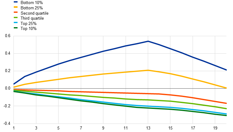 Note: The lines show the average consumption of different household groups sorted by wealth and expressed as percentage deviations from steady state values.