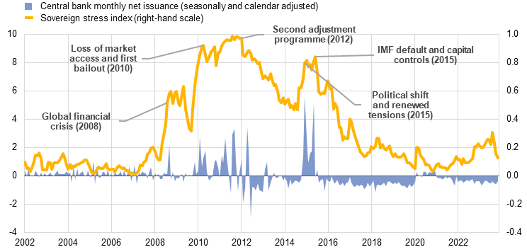 Notes: The blue area represents the monthly net banknote issuance in Greece, with reference values shown on the left-hand scale. The yellow line shows the monthly values of the SovCISS for Greece, with reference values shown on the right-hand scale.