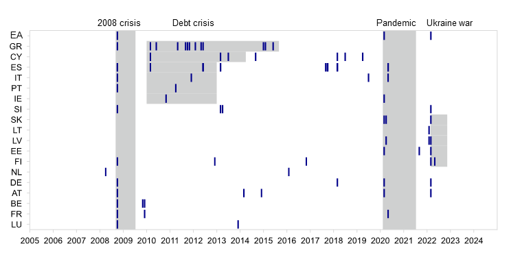 Notes: Grey shaded areas denote periods of major crisis events in the affected countries. Outliers for the net issuance of banknotes are computed using the monthly data series of euro area national central banks. The chart displays only positive outliers (vertical blue lines), which correspond to increases in net issuance. For each series, an ARIMA model is first identified and estimated; regression dummies for additive outliers (AO), permanent level shifts (LS) and transitory changes (TC) were introduced and their t‐statistics computed. Dummies exceeding a critical threshold (sample size-based) are selected using a stepwise forward selection/backward elimination routine (with LS as step functions, TC as exponentially decaying pulses with a preset decay rate and AO as isolated shocks). The model is re-estimated and the procedure repeats until no further significant outliers remain, optionally within a user-defined date range. The analysis excludes Croatia, as its accession to the euro area on 1 January 2023 means a sufficiently long and comparable historical data series was not available. Malta is also excluded because its net issuance data exhibit significant intermittency, which poses challenges for the reliable convergence and interpretation of the outlier detection algorithm.