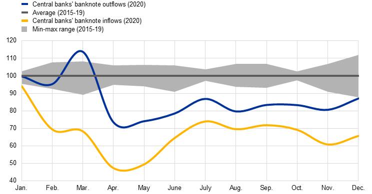 In other words, the pandemic starkly accentuated the so-called paradox of banknotes, due to a sharp rise in cash holdings coupled with weakened banknote flows. Evidence from central bank flows (Chart 3, panel b) shows that banknote outflows from central banks (i.e. withdrawals by commercial banks) in 2020 were initially high in March, but then fluctuated below pre-pandemic averages for much of the year. However, banknote inflows to central banks (i.e. deposits by commercial banks) fell even more strongly. This significant reduction in the return flow of cash, reflecting reduced retail turnover and a public inclination to hold onto banknotes, was the primary driver of the net increase in circulation (Tamele et al., 2021).