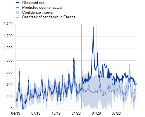 Our approach uses cash flow data from previous years (2015-16, 2016-17, 2017-18 and 2018-19) as explanatory variables. These historical periods were aligned with the period under review, 2019-20, on a matching-day basis, considering factors like the day of the week and its specific occurrence within the year. This method is appropriate because euro banknote issuance has historically been very stable, as evidenced by the relatively narrow maximum-minimum range from 2015 to 2019 (illustrated by the grey area in Chart 3, panel a). While these are not contemporaneous controls, this method improves our estimates in the absence of better alternatives, providing a conservative interpretation (i.e. with wide confidence intervals) of the observed impact.