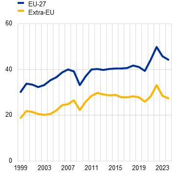 A modest reduction in Single Market barriers could compensate the likely trade losses from higher US tariffs. In the current geopolitical context, enhancing EU integration is especially important to mitigate the adverse effects of external trade tensions, such as those caused by recent US tariffs.[19] The ECB staff projections estimated that higher tariffs and uncertainty would cumulatively lower GDP by around 0.7 percentage points over the period 2025 to 2027.[20] Our simulation shows that achieving a reduction of just 2% in goods and services barriers within the Single Market could, in the long run, fully compensate for the projected impact on GDP of higher US tariffs. That would lead to an increase in intra-EU trade of around 3%. Of course, this would be unlikely to substitute for lost US trade immediately, as any structural adjustments within the Single Market would take time to materialise. Sustained regulatory, administrative and enforcement efforts would be required. Nonetheless, the estimates highlight the potential to take advantage of the vast size of the EU internal market. Trade within the EU accounts for more than half of total intra- and extra-euro area exports. Even a small increase in intra-EU trade could significantly offset external trade disruptions, demonstrating the economic potential of the Single Market.