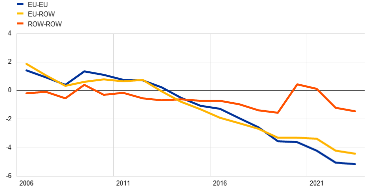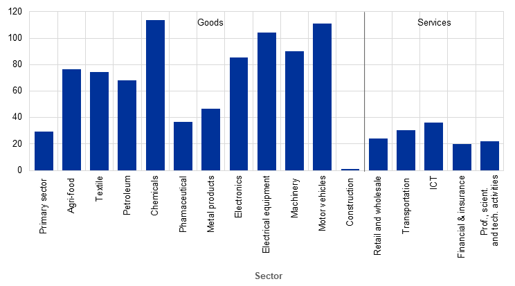Nonetheless, the empirical estimates suggest that trade costs of intra-EU trade in goods remain high. Regression results (Chart 5, panel b) indicate that in 2022 intra-EU trade frictions for goods – i.e. the costs of trading with other EU countries relative to trading domestically – remain significant, at 67% on aggregate for goods and 54% when considering only the manufacturing sector.[16] Within manufacturing, intra-EU costs for food products are the highest, with an ad valorem tariff equivalent of 150%, which may reflect the complexity of food trade within the EU and the limited scope of the common agricultural policy. In contrast, intra-EU trade costs in the chemical and pharmaceutical sectors are lower, which may reflect the significant efforts towards harmonisation and mutual recognition tools in these sectors.