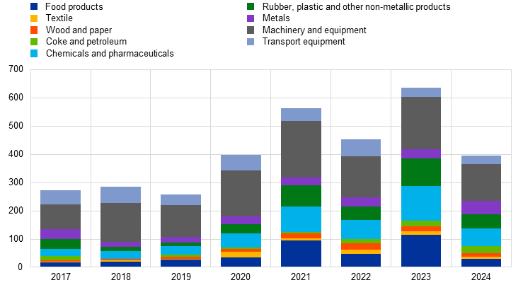 The data that are available suggest there are still hurdles to overcome for the Single Market to function more efficiently. The Global Trade Alert (GTA) database reveals that Member States still enact trade-distortive interventions, demonstrating that internal barriers still characterise the Single Market. By impeding or disincentivising trade, these measures could translate into material costs. A substantial proportion of these measures involve subsidies and export-supporting policies, which often create competitive imbalances within the Single Market. Machinery and food products are consistently among the most affected sectors in the manufacturing industry (Chart 3).