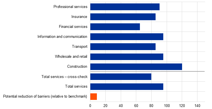 The analysis also highlights untapped potential for further integration (Chart 6, panel b). Just as for goods, if taken in isolation, the estimates presented in the previous paragraph overstate the extent of barriers within the Single Market that can be reduced through policy reforms. A more realistic assessment of the untapped potential of the Single Market is provided by the benchmarking exercise. The empirical estimates again suggest that the Netherlands is the benchmark to assess the scope for deeper EU integration in services markets. This is broadly consistent with the indications provided by the OECD Service Trade Restrictiveness Index, which suggests that the Netherlands has a relatively low level of regulatory restrictiveness (Chart 4). The trade costs estimated for the benchmark remain well below the EU average. If other countries were to achieve similar levels of integration, the estimates suggest a reduction in trade costs of around 9 percentage points. As with the goods market, these estimates suggest there is scope for relatively substantial gains in integration if countries can reach this benchmark: a 9 percentage point reduction is similar to the decrease in barriers achieved in the past two decades.