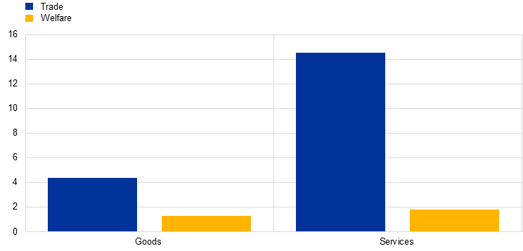 Reducing trade barriers within the Single Market, as identified in the benchmark exercises of the previous sections, could result in substantial long-term welfare gains, particularly in services. The analysis in Chart 7 evaluates the potential gains from closing the gap with the benchmark country in the goods and services markets. In practice, a counterfactual exercise evaluates the gains in terms of increased trade and welfare resulting from the reduction of trade barriers quantified in the benchmark exercise – 8 percentage points in goods and 9 percentage points in services within the EU. A reduction of barriers for goods would lead to an increase in intra-EU trade of 4.4% and estimated welfare gains of 1.3%. However, lower trade barriers for services would achieve a larger increase in trade (14.5%) and a larger welfare increase (1.8%). The higher gains from services reflect their significant potential for further integration (as services sectors face higher initial trade barriers). It also reflects the importance of services in the overall economy, as they represent a larger share of domestic expenditure and have downstream linkages. Therefore, a comparable cost reduction generates greater effective integration and broader general-equilibrium gains.