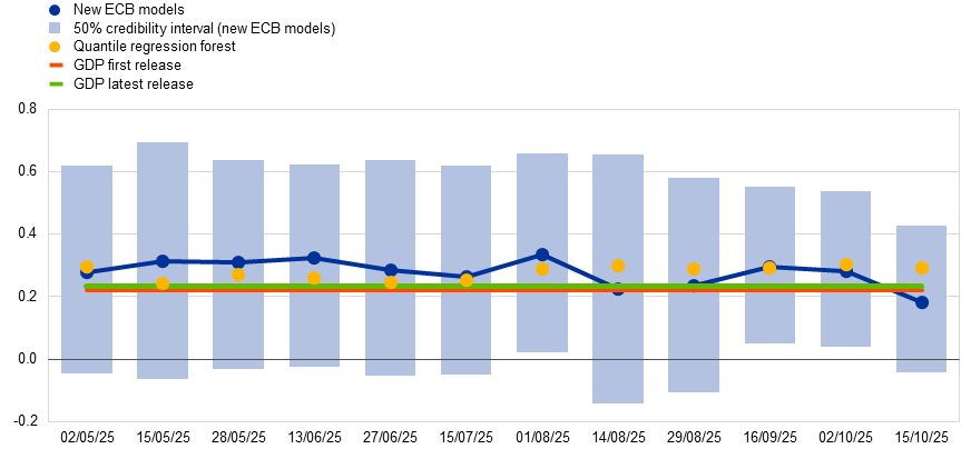 Notes: The blue line represents the point forecasts for real GDP growth in the third quarter of 2025 based on the new ECB models from different forecast updates (x-axis). The bars indicate the range of possible outcomes with a 50% probability (50% credibility interval or interquartile range) based on the new ECB models. The point forecasts of the complementary quantile regression forest model are shown as yellow dots. The red and green lines refer, respectively, to the preliminary flash estimate (30 October) and the flash estimate (14 November) of GDP growth published by Eurostat.