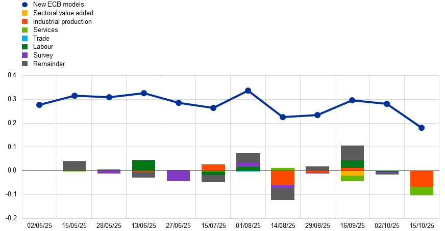 Notes: The blue line represents the median point forecasts of the new ECB models (from the combined density of two bridge equations) for real GDP growth in the third quarter of 2025 from different forecast updates (x-axis). The bars indicate the decomposition of forecast revisions between consecutive updates into news stemming from different groups of indicators: Sectoral value added = sectoral value added GDP components; Industrial production = industrial production indicators; Services = services and retail indicators; Trade = international trade-related indicators; Labour = labour market indicators; Survey = survey-based indicators; Remainder = effects of historical data revisions and parameter re-estimations.