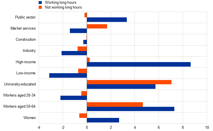 Notes: The data include employees aged 20-64. “Not working long hours” is defined as 0-49 hours per week. High- (low-) income employees are employees in the top (bottom) three income deciles. The bars show the change in the proportion of all employees working (not working) long hours who belong to each category. For instance, the proportion of employees working in the public sector increased by 3.3 percentage points for employees working long hours, while it decreased by 0.2 percentage points for employees not working long hours.