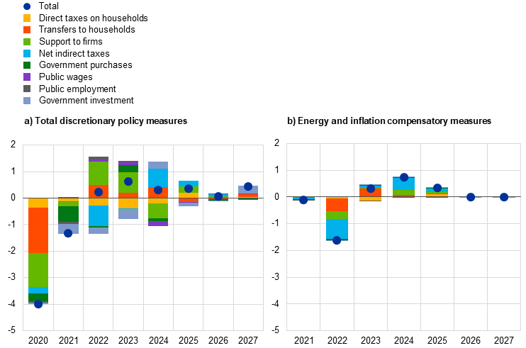 Model simulations point to sizeable macroeconomic effects of the discretionary fiscal policy measures since the start of the pandemic, compared with a counterfactual scenario in which these measures were not introduced. The total discretionary fiscal policy measures implemented since 2020 are estimated to have substantially supported real GDP growth over 2020-2022 and to have been broadly neutral or had a somewhat moderating impact on growth thereafter (Chart B, panel a). With regard to inflation as measured by the Harmonised Index of Consumer Prices (HICP), the simulations point to a dampening effect in 2022, mainly on account of the energy and inflation compensatory measures that helped to smooth the peak impact of the energy shock. However, they indicate an overall upward impact later on (Chart B, panel b), particularly during the years 2023-2024 when governments started to withdraw the energy price support granted in 2022 and there was a build-up of inflationary pressures resulting from the fiscal stimulus in previous years.[7]