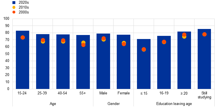 The increase in popular support for the euro is similarly broad-based across sociodemographic groups, with somewhat larger increases among groups with historically slightly lower support. A breakdown by age, gender and education leaving age reveals that average support has risen in almost all groups during the 2020s compared with the previous two decades (Chart C).[1] This contrasts with the relatively limited change that occurred between the 2000s and the 2010s. The strongest increases can be seen among respondents who completed their full-time education before the age of 16, those aged 55 and above, and women.[2] While these groups historically had lower levels of support, the strong increase in the 2020s has helped reduce the gap with the groups that have consistently shown the highest support, namely respondents under the age of 25, those who left full-time education at the age of 20 or above – which includes respondents who have completed tertiary education – and men. Notably, between 2000 and 2024, support for the euro among women rose from 61% to 78%, all but closing the prior gap in support levels among men and women.