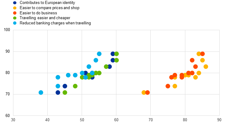 Note: Each point reflects the share of a sociodemographic group (as shown in Chart C) that sees the euro as a good thing for the EU (y-axis) and the share that experiences the respective benefit of the euro (x-axis).