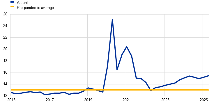 Notes: Seasonally adjusted data. The pre-pandemic average is computed from the first quarter of 1999 to the fourth quarter of 2019. The latest observation is for the second quarter of 2025.