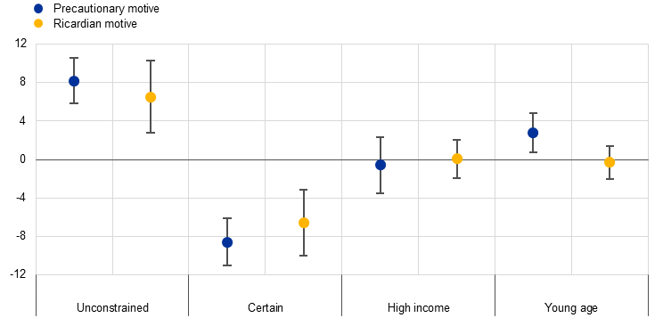 Households’ uncertainty about their own financial situation also appears to play an important role in saving decisions. Household-level information from the Consumer Expectations Survey (CES) is used to shed light on factors not captured by standard macroeconomic determinants, as indicated by the positive unexplained component in the model-based decomposition since mid-2022 (Chart C). In particular, the analysis focuses on policy-related and individual uncertainty, as reflected in Ricardian and precautionary saving motives.[4] A new question fielded in the November 2025 CES questionnaire reveals that precautionary and Ricardian motives are each relevant for around 50% of respondents in their saving decisions, with 25-30% also indicating one or the other as the most important reason to save (Chart D, panel a).[5] A closer look at cross-sectional differences across participants shows that the importance of these two motives depends mainly on the economic constraints faced by respondents and the degree of uncertainty about their financial situation, while differences across income and age seem to play a more muted role (Chart D, panel b). Households with no self-reported liquidity constraints are more likely to attach significantly higher importance to both motives, consistent with their stronger capacity to plan and save (“unconstrained”). At the same time, respondents reporting a high degree of certainty about their future financial situation (“certain”) attach significantly less importance to the two motives than households facing greater uncertainty. The similarities in the determinants of the two motives would suggest that they are close conceptually, with respondents tending to perceive the actions of the government as an additional source of income uncertainty. This is consistent with previous analysis that has highlighted the importance of geopolitical and policy uncertainty for consumer spending.[6]