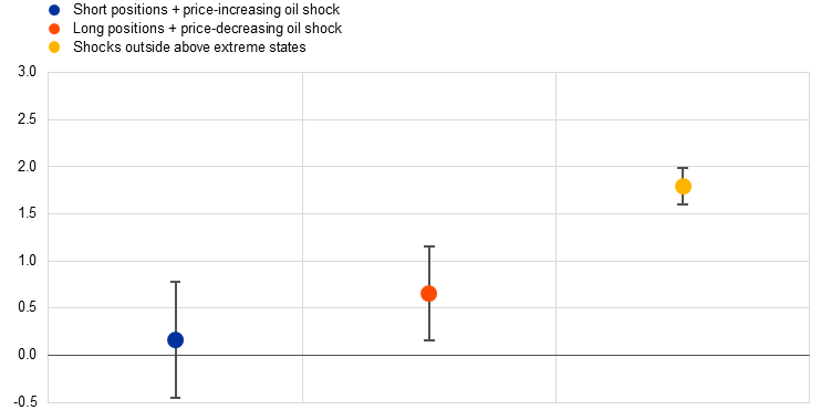 Notes: The chart shows the absolute oil price response to an oil supply shock (four weeks after the shock) based on non-linear local projections. In a linear framework, the same shock leads to a price increase of 1.5%. The extreme states in all three panels correspond to periods in which the state variable lies above the 75th percentile or below the 25th percentile of its recent historical distribution (last 52 weeks). The yellow dots denote oil price responses observed outside the extreme states shown in each panel. For example, in panel b), they capture price reactions when positions are at normal levels or when positions are extremely short (long) and the shock causes oil prices to fall (rise). The error bars indicate 68% confidence intervals.