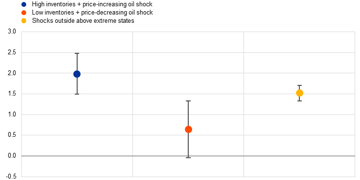 Notes: The chart shows the absolute oil price response to an oil supply shock (four weeks after the shock) based on non-linear local projections. In a linear framework, the same shock leads to a price increase of 1.5%. The extreme states in all three panels correspond to periods in which the state variable lies above the 75th percentile or below the 25th percentile of its recent historical distribution (last 52 weeks). The yellow dots denote oil price responses observed outside the extreme states shown in each panel. For example, in panel b), they capture price reactions when inventories are at normal levels or when inventories are extremely low (high) and the shock causes oil prices to fall (rise). The error bars indicate 68% confidence intervals.