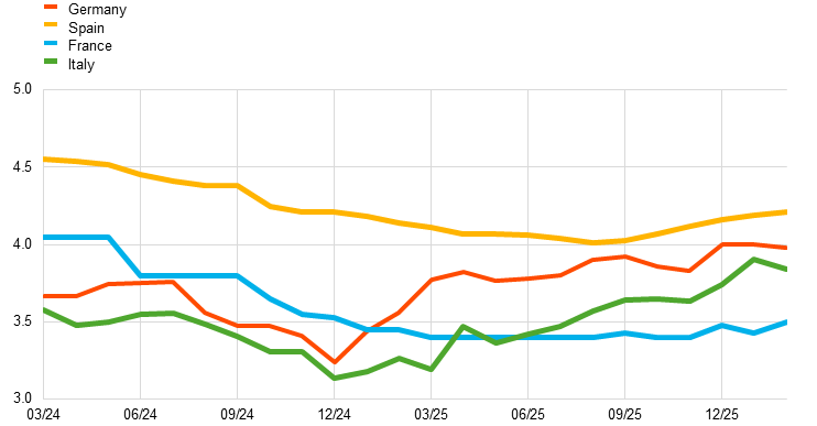 2. Online mortgage data track loans of exact maturity fixation for constant borrower characteristics and can therefore better proxy the rates offered by banks, while interest rate statistics reflect the equilibrium between the rates offered by banks and decisions made by borrowers. Very long-term mortgage rates are available rates with initial fixation periods as close as possible to 30 years. This means a 30-year period for Germany, Spain and Italy and a 25-year period for France.